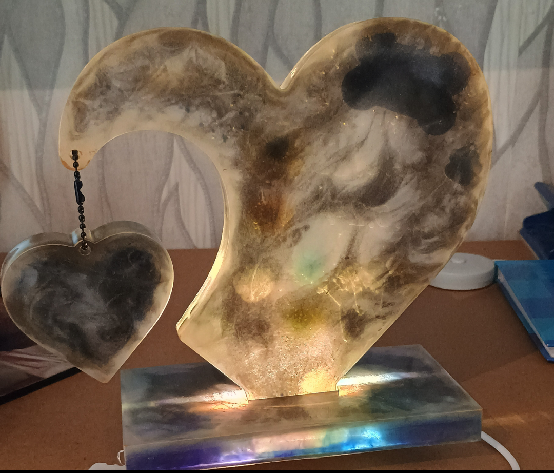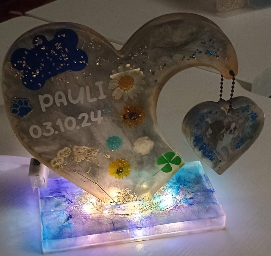Das Herz wird auf Bestellung handgefertigt, gegossen. Du kannst mir gern einen kleinen Teil persönliche Dinge zusenden (NACH BESTELLUNG MIT RECHNUNGSNUMMER) damit ich es mit einarbeiten kann. Das kann sein: Haare, Halsband, Mini Urne gefüllt mit etwas Asche von Mensch/Tier, Ringe, Mini Parfumflasche etc.pp. Es ist fast alles möglich.