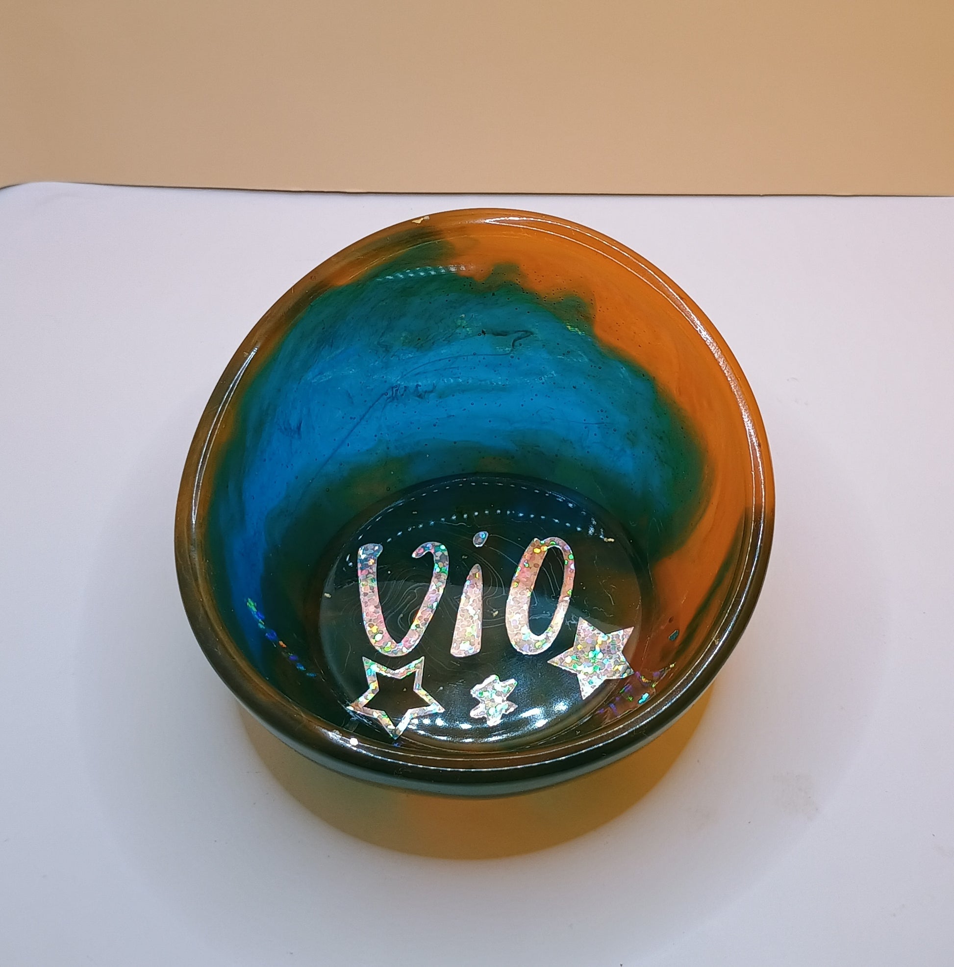 Die Schale hat eine Rechteckige Ovale - Form und kann in deinen Wunschfarben gestaltet werden. Mit Glitzer, mit Motiv und gern mit Namen oder Text, personalisiert.