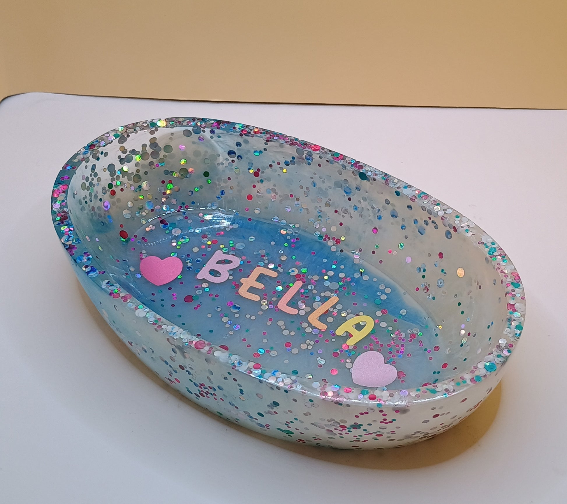 Die Schale hat die Ovale-Form und kann in deinen Wunschfarben gestaltet werden. Mit Glitzer, mit Motiv oder oder Foto und gern mit Namen oder Text, personalisiert.